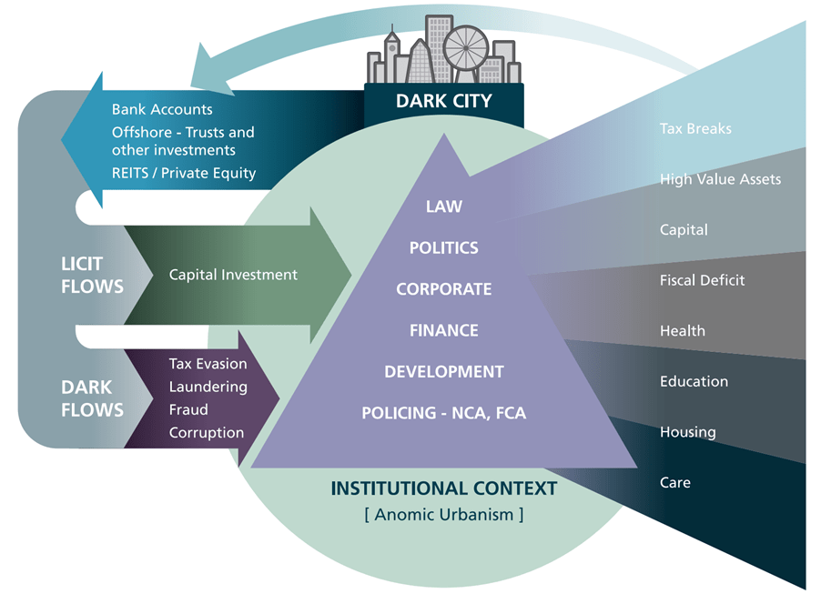 Theory is important to guiding the actions of policymakers and communities touched by the costs of criminal capital. One of the things that the dark city model tries to achieve is to help us to visualise the architecture of something as complex as the urban economy, its relationship to illicit financial flows, and the kinds of outputs that this generates for everyday urban life.